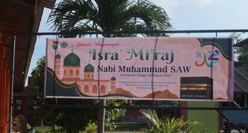 Bengkalis - Suasana pagi penuh khidmat menyelimuti sekolah SMKN 1 Bengkalis. Dengan menggunakan baju muslim dan muslimah seluruh warga sekolah berkumpul di Aula Awang Mahmuda untuk mengikuti kegiatan Isra’ wal Mi’raj Nabi Muhammad SAW (1444 H). Acara yang diadakan pada jum’at (17/02/2023) diawali dengan penampilan group seni oleh siswa/i gabungan dari berbagai program keahlian. Kemudian acara dilanjutkan dengan pembacaan ayat suci alqur'an oleh Natasya dari kelas X DPIB B.